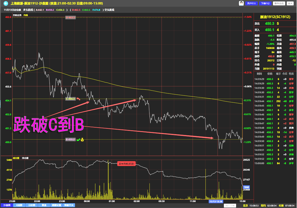 下图有中线显示,价格波动区间是中线-C,C是多头防线,价格跌到C点有多头护盘。空头在自己的阵地前沿提前阻击对方,价格每次到达中线,都被空头打压下跌。