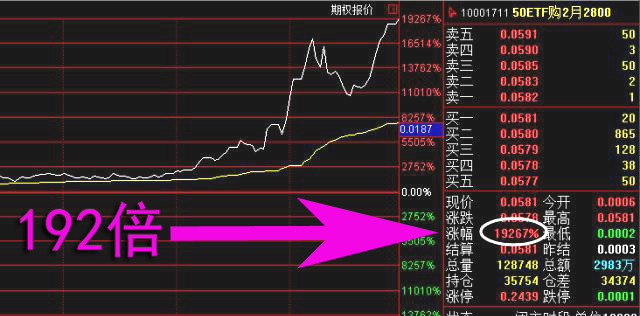 比如,用1000元买了20手豆粕看涨期权,之后1小时豆粕期货价格涨了30点,你的20手看涨期权可能已经盈利了500元,这就是1小时盈利50%。50ETF期权有时候更夸张,曾在一天里涨了192倍(见下图),如果你在当天开盘或前一天买入1000元,到收盘平仓就变成19.2万。