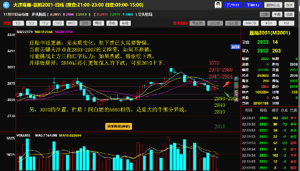 由上图可以看到,我们在几天前就分析了豆粕价格的运动方向,2893-2907是个牛熊分水岭。如果价格跌破这个关键价位,豆粕将是下跌趋势,下跌目标第一是2849,第二目标是2810。