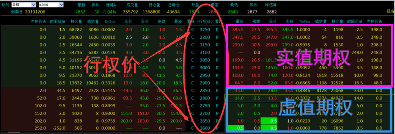 看下图,中间画圈的竖排是行权价格,右上侧粉色框是实值期权,右下侧蓝色框是虚值期权。