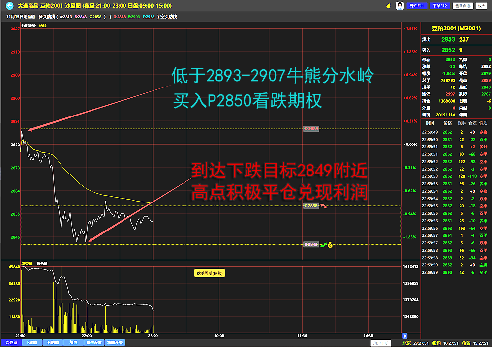 还有一些时候,我们操作的比较顺手,比如下图,基于低于2893-2907就是熊市的判断,我们选择做空豆粕,买入看跌期权,14日晚上夜盘豆粕期货价格大跌,最低点2843,到达沙盘B点,B是多头防线,这里可能会有多头力量反扑,也是前面计算的下跌第一目标位置2849附近,如下图。