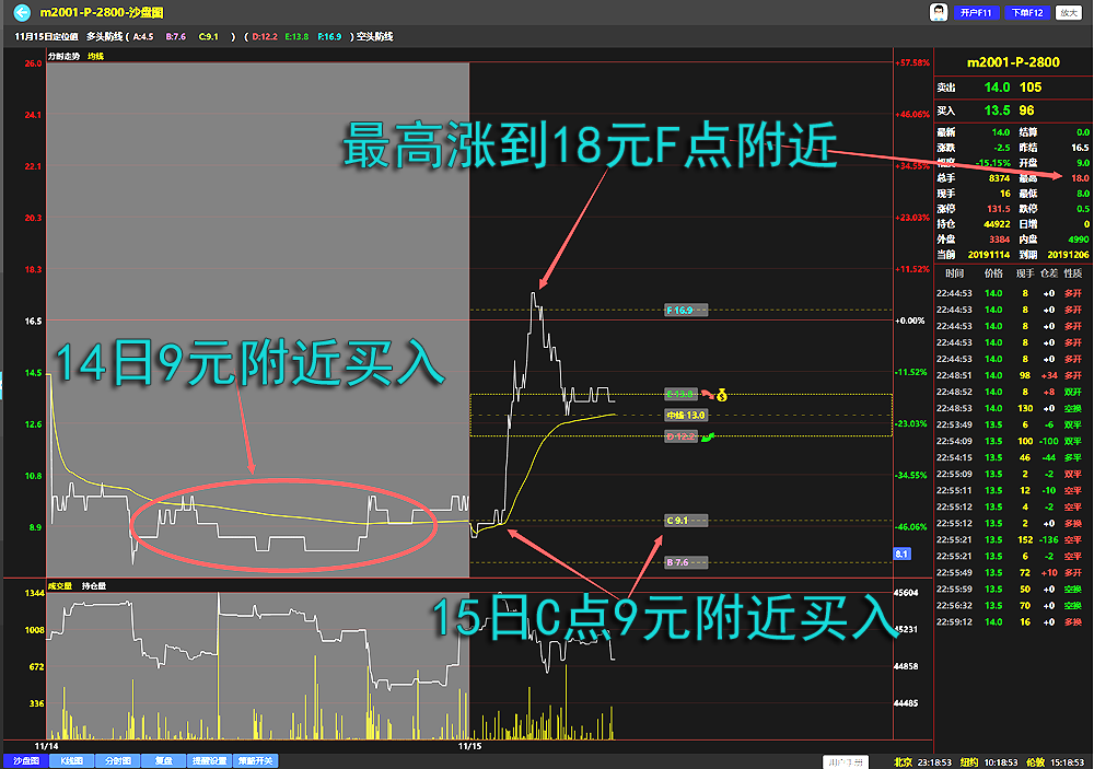 对应在期权沙盘图M2001-P-2850的行情上,下图可以看到,标记出了ABCDEF的6个数字,ABC就是时空的低点,是可以买入建仓的价格,DEF就是时空的高点,是要及时卖出兑现利润的位置。